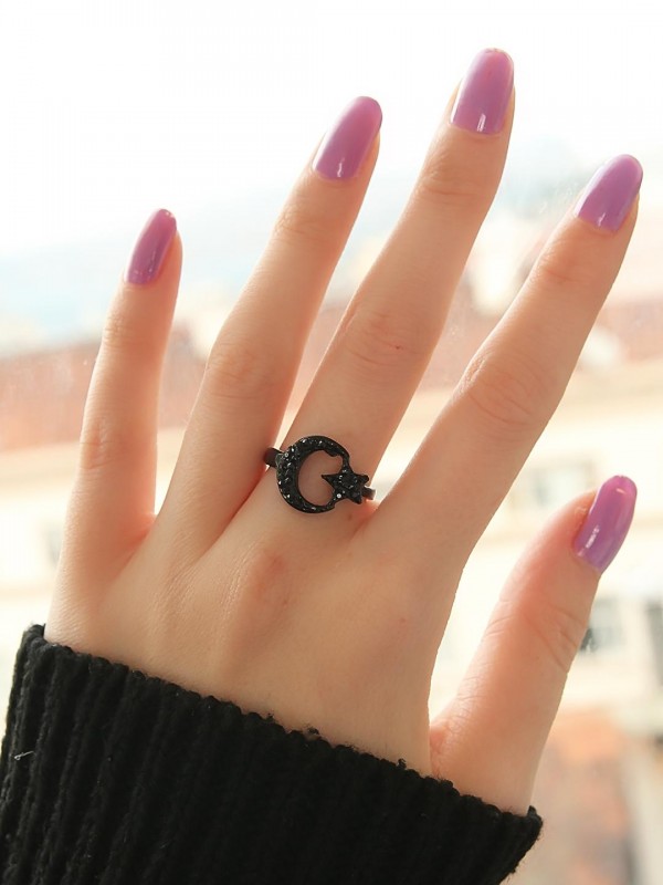 Siyah Metal Zirkon Taşlı Ay Yıldız Bayan Yüzük