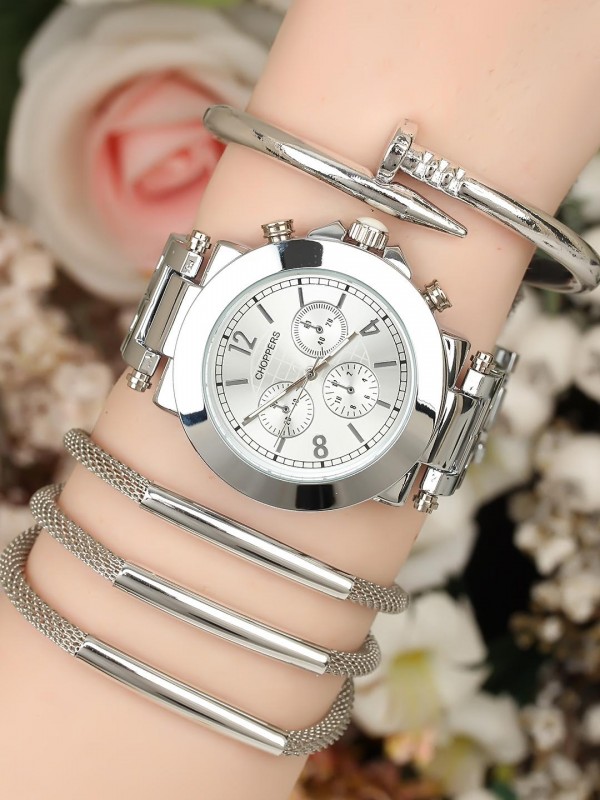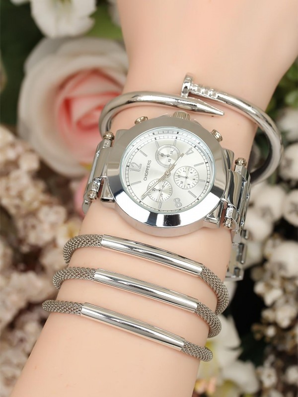Çoklu ve çivi bileklik tasarımlı silver renk Metal Kordonlu Bayan Saat Kombini