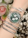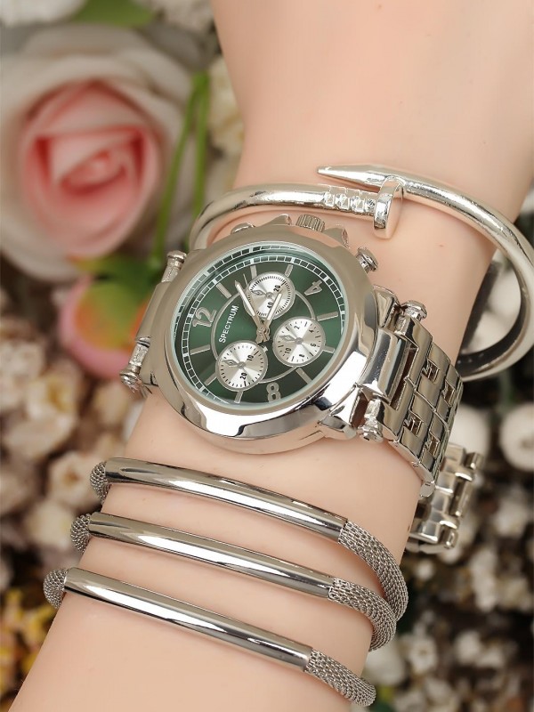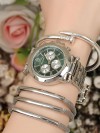 Çoklu ve çivi bileklik tasarımlı spor kasa yeşil iç tasarımlı silver renk Metal Kordonlu Bayan Saat Kombini -Saatin yanında kaç adet bileklik varsa saat ile birlikte hepsi geliyor (hepsi fiyata dahil.)