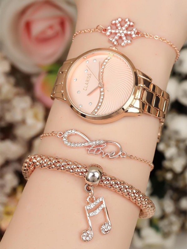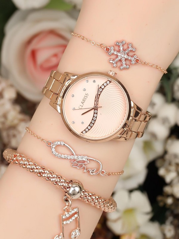 Taşlı ve metal bileklik tasarımlı rose renk Metal Kordonlu Clariss Marka Bayan Saat Kombini