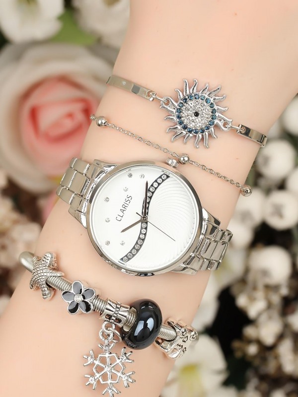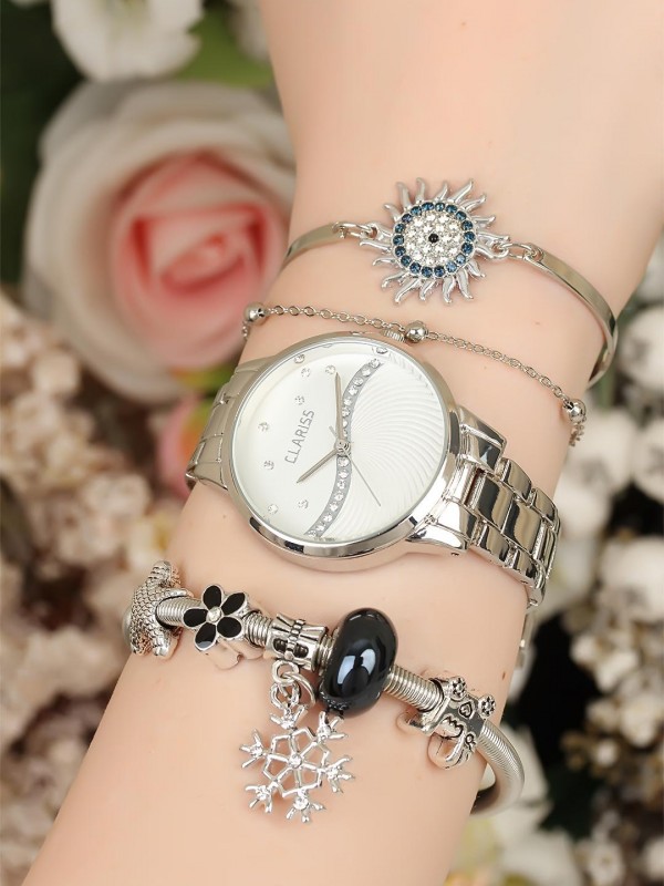 Taşlı ve charm bileklik tasarımlı silver renk Metal Kordonlu Clariss Marka Bayan Saat Kombini -Saatin yanında kaç adet bileklik varsa saat ile birlikte hepsi geliyor (hepsi fiyata dahil.)