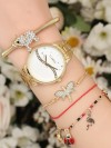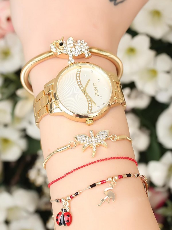 Şık kadınlar için yusufçuk ve uğur böcekli Gold Renk Taşlı İç Tasarımlı Metal Kordonlu Clariss Marka Bayan Saat ve Filli Bileklik Kombini harika bir tercih olacak.