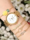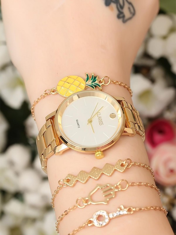 Gold Renk Kaplama Metal Kordonlu Clariss Marka Bayan Saat ve Ananaslı Bileklik Kombini